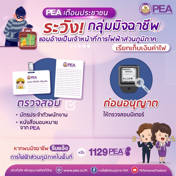การไฟฟ้าส่วนภูมิภาค (PEA) ขอแจ้งเตือนประชาชนให้ระมัดระวังกลุ่มมิจฉาชีพ ที่แอบอ้างเป็นเจ้าหน้าที่ของการไฟฟ้าส่วนภูมิภาค ดำเนินการเรียกเก็บเงินค่าไฟฟ้าและเตือนอย่าหลงเชื่อกลุ่มมิจฉาชีพดังกล่าว พร้อมแนะนำให้ประชาชนเรียกตรวจสอบบัตรประจำตัวพนักงานของการไฟฟ้าส่วนภูมิภาคและหนังสือมอบหมายจากการไฟฟ้าส่วนภูมิภาค ก่อนอนุญาตให้เข้าตรวจสอบมิเตอร์ไฟฟ้าทุกครั้ง