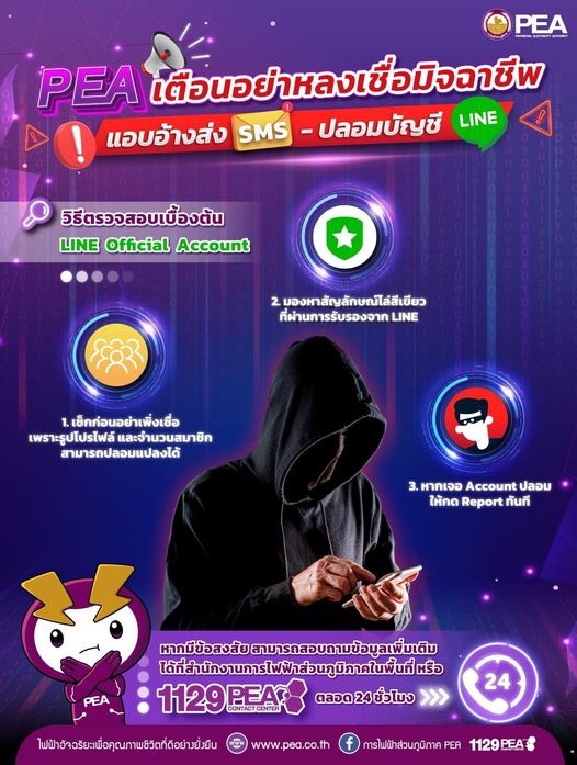 การไฟฟ้าส่วนภูมิภาคจึงขอความร่วมมือประชาชนหากพบเห็นบุคคลต้องสงสัย หรือพบมิจฉาชีพแอบอ้างเป็นเจ้าหน้าที่ของการไฟฟ้าส่วนภูมิภาค โปรดแจ้งการไฟฟ้าส่วนภูมิภาคในพื้นที่ หรือ โทร. 1129 PEA Contact CENTER ตลอด 24 ชั่วโมง