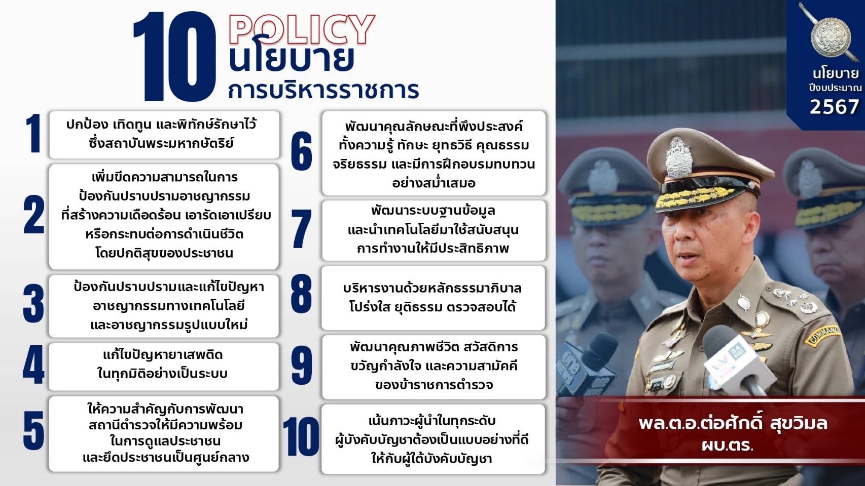 เปิด 10 นโยบายบริหารราชการ “บิ๊กต่อ” พร้อม 4 นโยบายเน้นหนัก และ5 แผนปฏิบัติการเร่งรัด ภายใต้วิสัยทัศน์ องค์กรปราบปรามอาชญากรรมและบังคับใช้กฎหมาย ในระดับมาตรฐานสากล ที่ประชาชนเชื่อมั่นศรัทธา”และเจตนารมณ์ 5 ข้อ“ต่อ-ศักดิ์-สุข-วิ-มล”