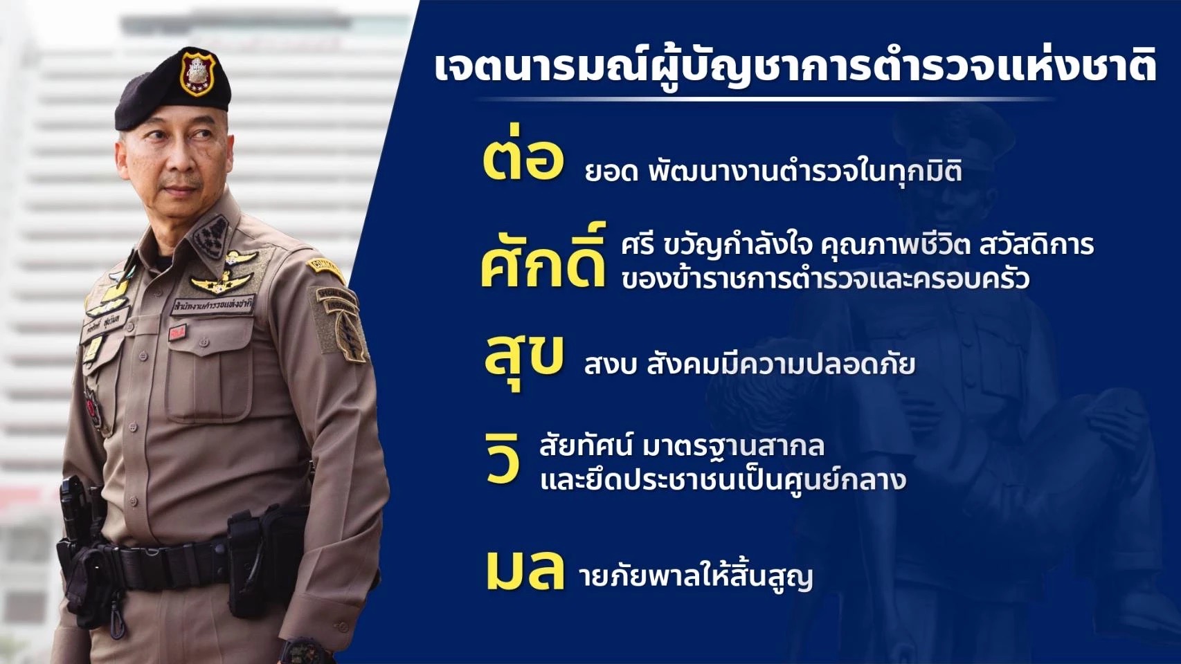 - พัฒนาคุณภาพชีวิต สวัสดิการ ขวัญกำลังใจ และความสามัคคีของข้าราชการตำรวจ