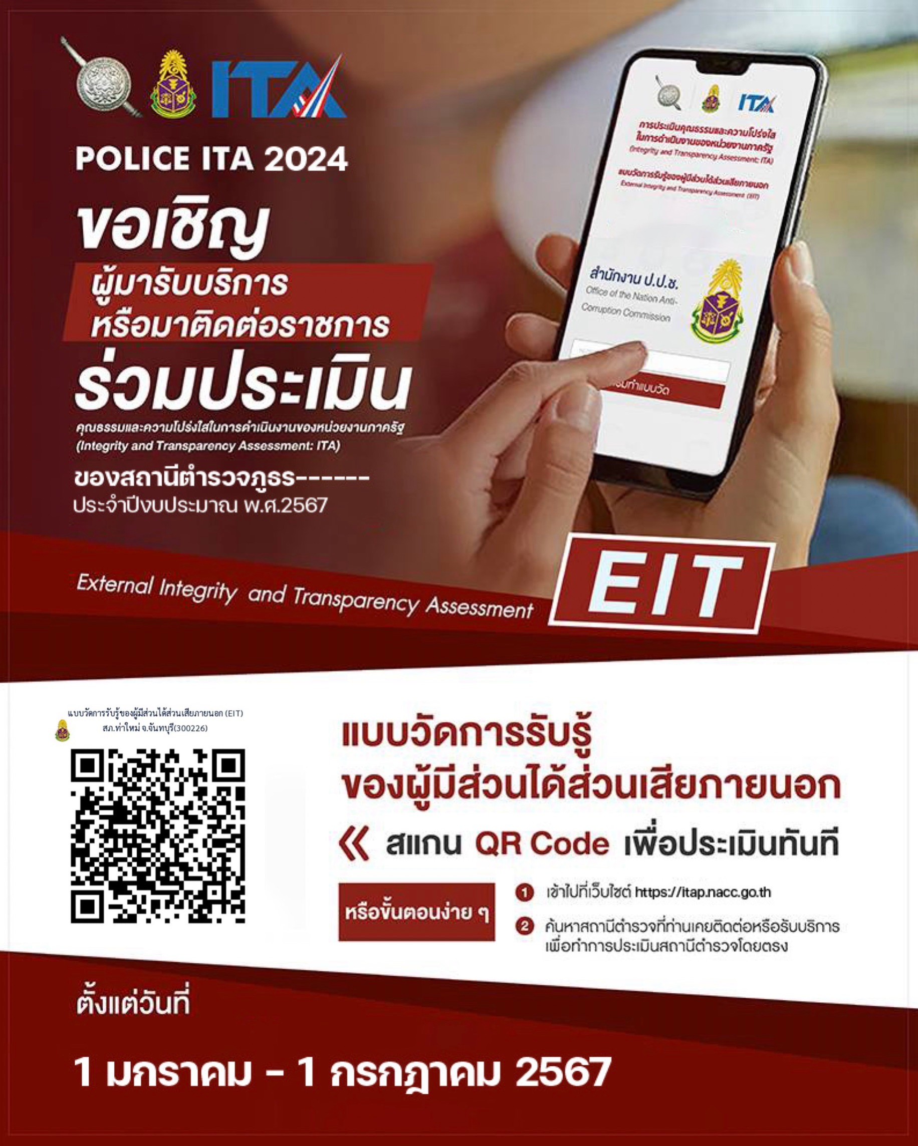 ขอเชิญผู้มารับบริการหรือมาติดต่อราชการ ร่วมประเมินคุณธรรมและความโปร่งใส ในการดำเนินงานของหน่วยงานภาครัฐ (ITA) ของสถานีตำรวจภูธรท่าใหม่ ประจำปีงบประมาณ พ.ศ.2567 โดยสแกน QR Code เพื่อทำแบบประเมินวัดการรับรู้ของผู้มีส่วนได้ส่วนเสียภายนอก ตั้งแต่วันที่ 1 มกราคม - 1 กรกฎาคม 2567